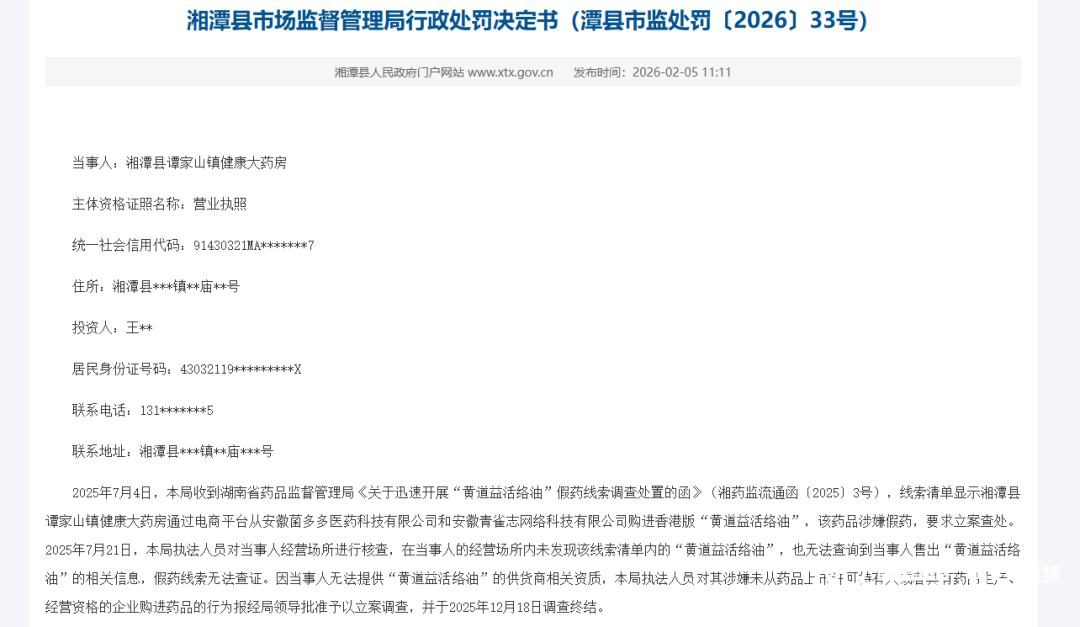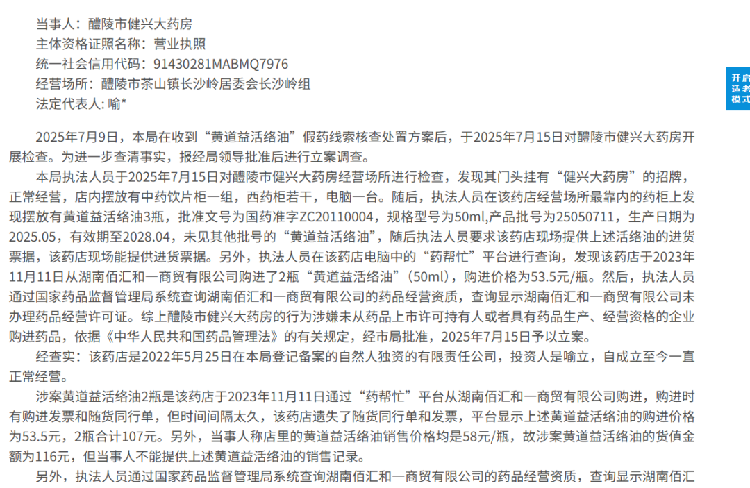 2026年1月,湖南醴陵市健兴大药房因从无《药品经营许可证》的公司购进“黄道益活络油”,被没收违法所得并罚款共计5116元。